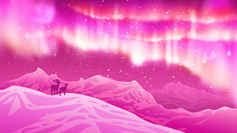 A pink mountain range with northern lights illuminating them; a stunning magical wallpaper for your computer. Complete with two deer watching the beauty unfold.
