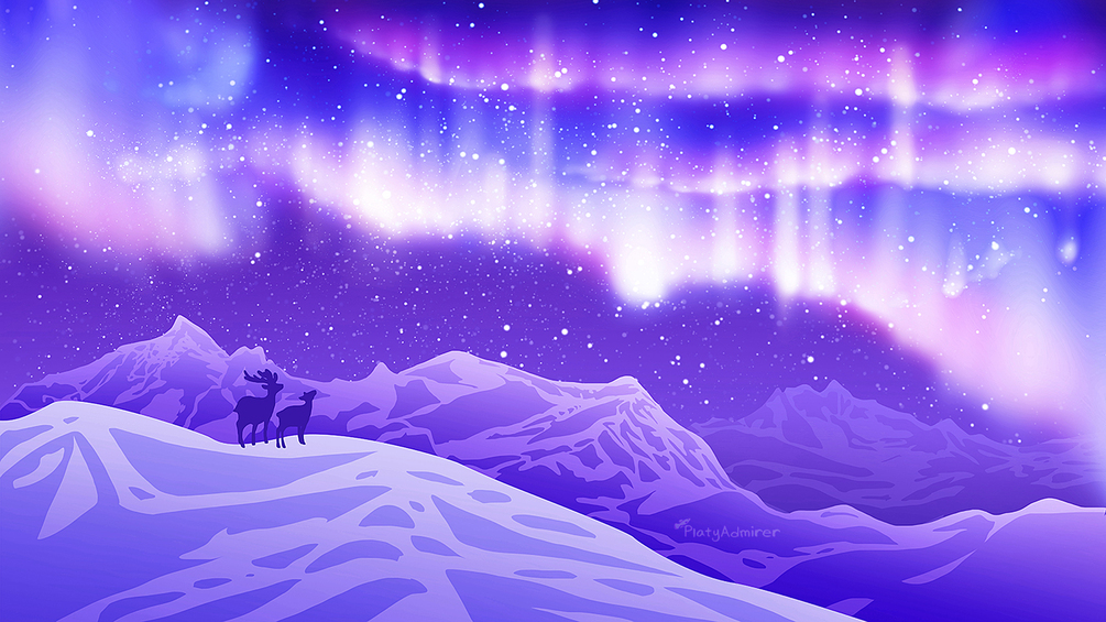 A purple mountain range with northern lights illuminating them; a stunning magical wallpaper for your computer. Complete with two deer watching the beauty unfold.